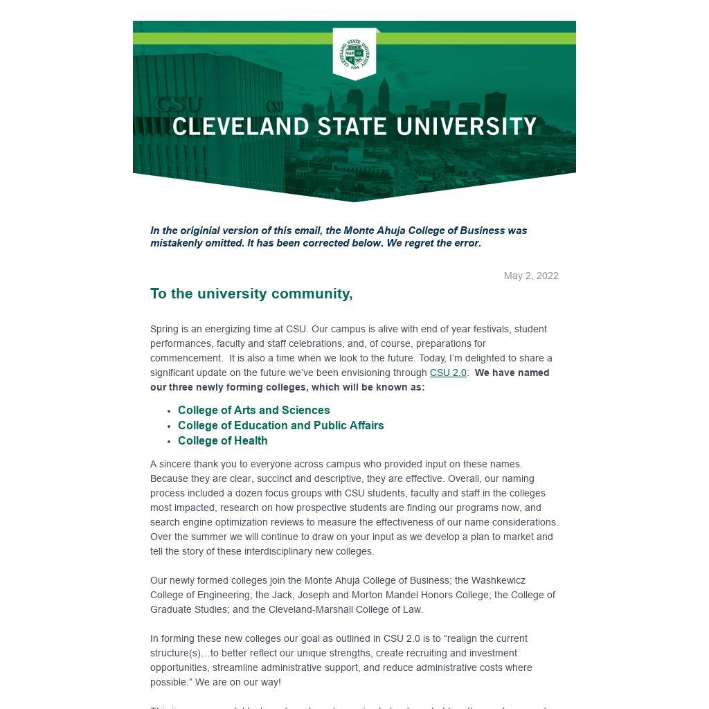 Our newly formed colleges join the Monte Ahuja College of Business; the Washkewicz College of Engineering; the Jack, Joseph and Morton Mandel Honors College; the College of Graduate Studies; and the Cleveland-Marshall College of Law.
