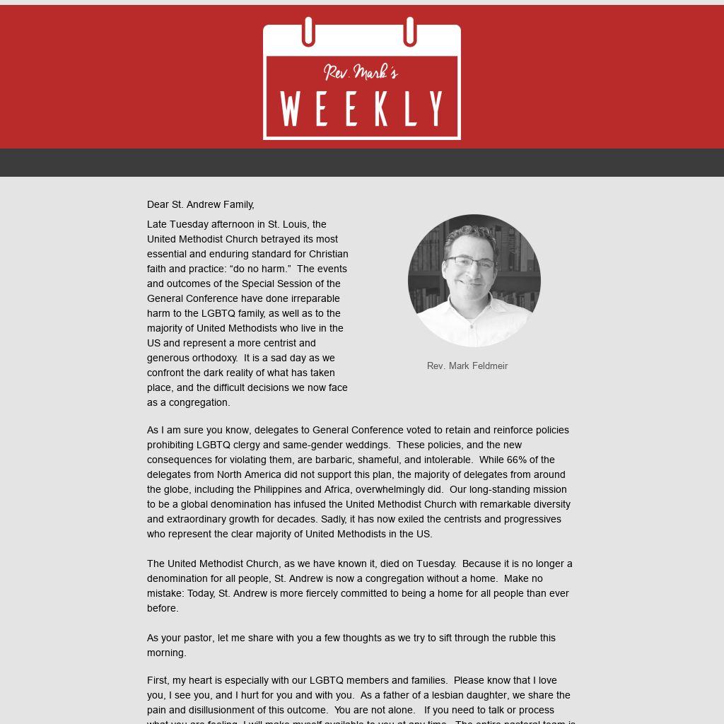 Fourth, St. Andrew will have a key voice in the conversation about what is next for those United Methodists now exiled by the decisions of General Conference. St. Andrew is the second largest Reconciling congregation in the denomination, and we will not accept the status quo. We will consider every option before us, including a gracious exit from the denomination. These conversations will begin soon, but will likely last for months. Your patience and grace, along with your input, will prove necessary and invaluable.