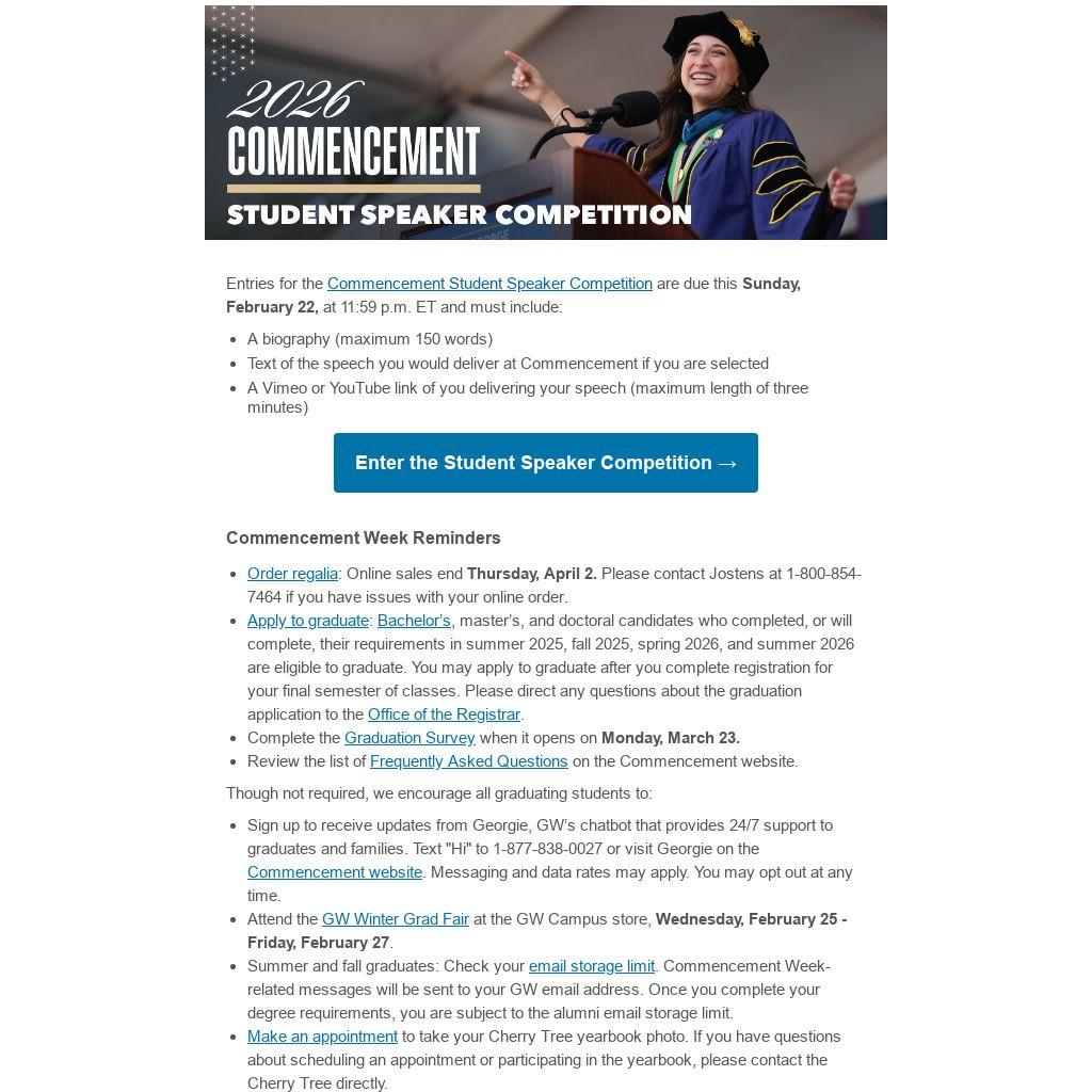 Summer and fall graduates: Check your email storage limit. Commencement Week-related messages will be sent to your GW email address. Once you complete your degree requirements, you are subject to the alumni email storage limit.