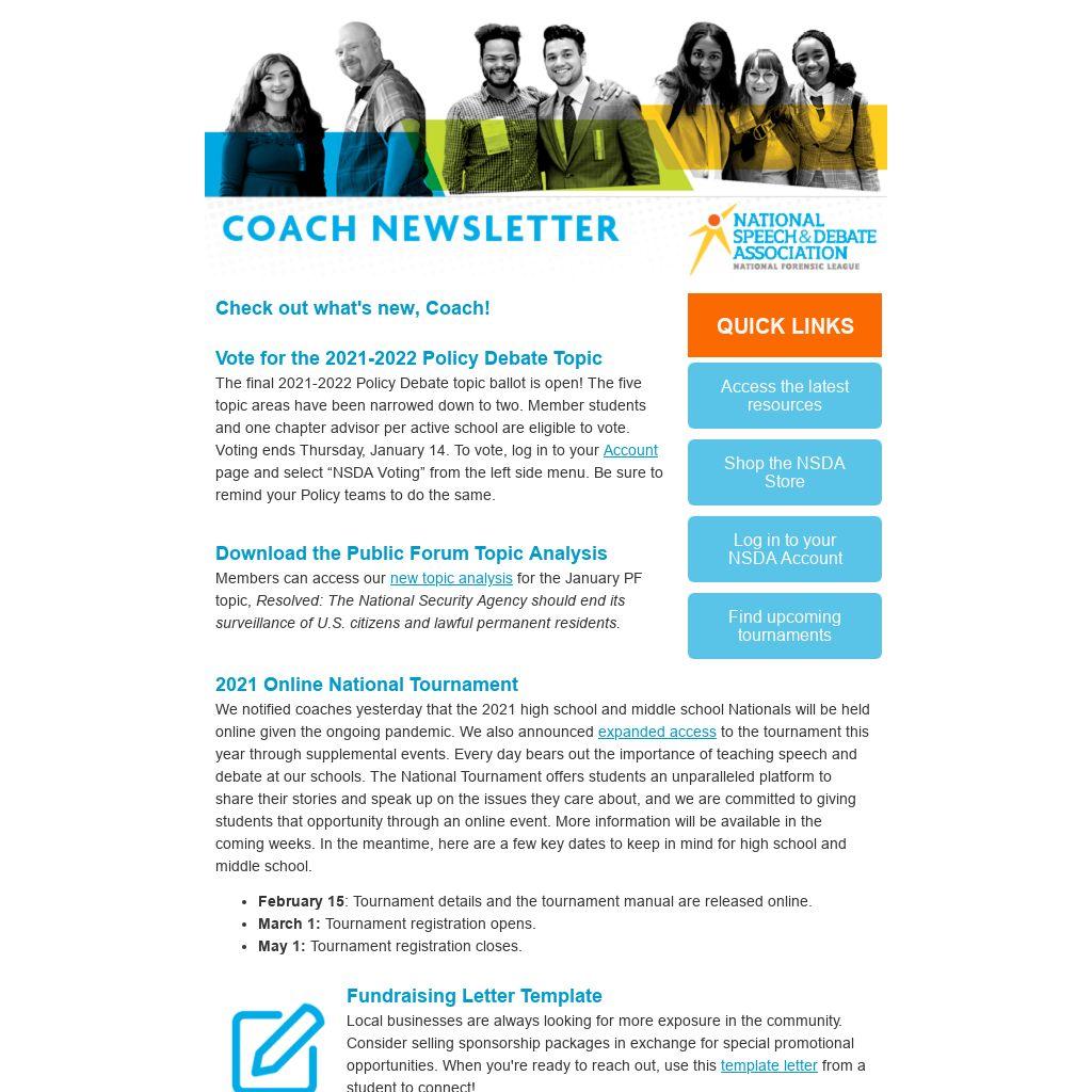 2021 Online National TournamentWe notified coaches yesterday that the 2021 high school and middle school Nationals will be held online given the ongoing pandemic. We also announced expanded access to the tournament this year through supplemental events. Every day bears out the importance of teaching speech and debate at our schools. The National Tournament offers students an unparalleled platform to share their stories and speak up on the issues they care about, and we are committed to giving students that opportunity through an online event. More information will be available in the coming weeks. In the meantime, here are a few key dates to keep in mind for high school and middle school.