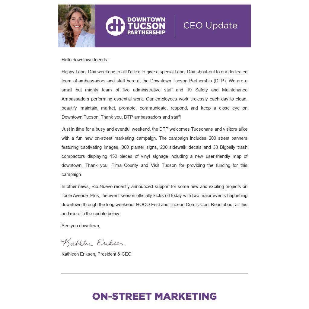 Happy Labor Day weekend to all! I'd like to give a special Labor Day shout-out to our dedicated team of ambassadors and staff here at the Downtown Tucson Partnership (DTP). We are a small but mighty team of five administrative staff and 19 Safety and Maintenance Ambassadors performing essential work. Our employees work tirelessly each day to clean, beautify, maintain, market, promote, communicate, respond, and keep a close eye on Downtown Tucson. Thank you, DTP ambassadors and staff!