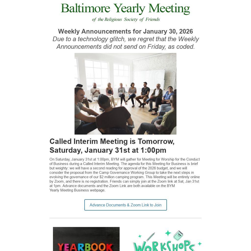 On Saturday, January 31st at 1:00pm, BYM will gather for Meeting for Worship for the Conduct of Business during a Called Interim Meeting. The agenda for this Meeting for Business is brief but weighty: we will have a second reading for approval of the 2026 budget, and we will consider the proposal from the Camp Governance Working Group to take the next steps in evolving the governance of our $2 million camping program. This Meeting will be entirely online by Zoom, and there is no registration. Friends can simply join at the Zoom link at Sat, Jan 31st at 1pm. Advance documents and the Zoom Link are both available on the BYM Yearly Meeting Business webpage.
