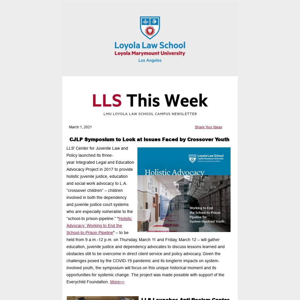 LLS' Center for Juvenile Law and Policy launched its three-year Integrated Legal and Education Advocacy Project in 2017 to provide holistic juvenile justice, education and social work advocacy to L.A. “crossover children” – children involved in both the dependency and juvenile justice court systems who are especially vulnerable to the “school-to prison-pipeline.” "Holistic Advocacy: Working to End the School-to-Prison Pipeline" – to be held from 9 a.m.-12 p.m. on Thursday, March 11 and Friday, March 12 – will gather education, juvenile justice and dependency advocates to discuss lessons learned and obstacles still to be overcome in direct client service and policy advocacy. Given the challenges posed by the COVID-19 pandemic and its longterm impacts on system-involved youth, the symposium will focus on this unique historical moment and its opportunities for systemic change. The project was made possible with support of the Everychild Foundation. More>>