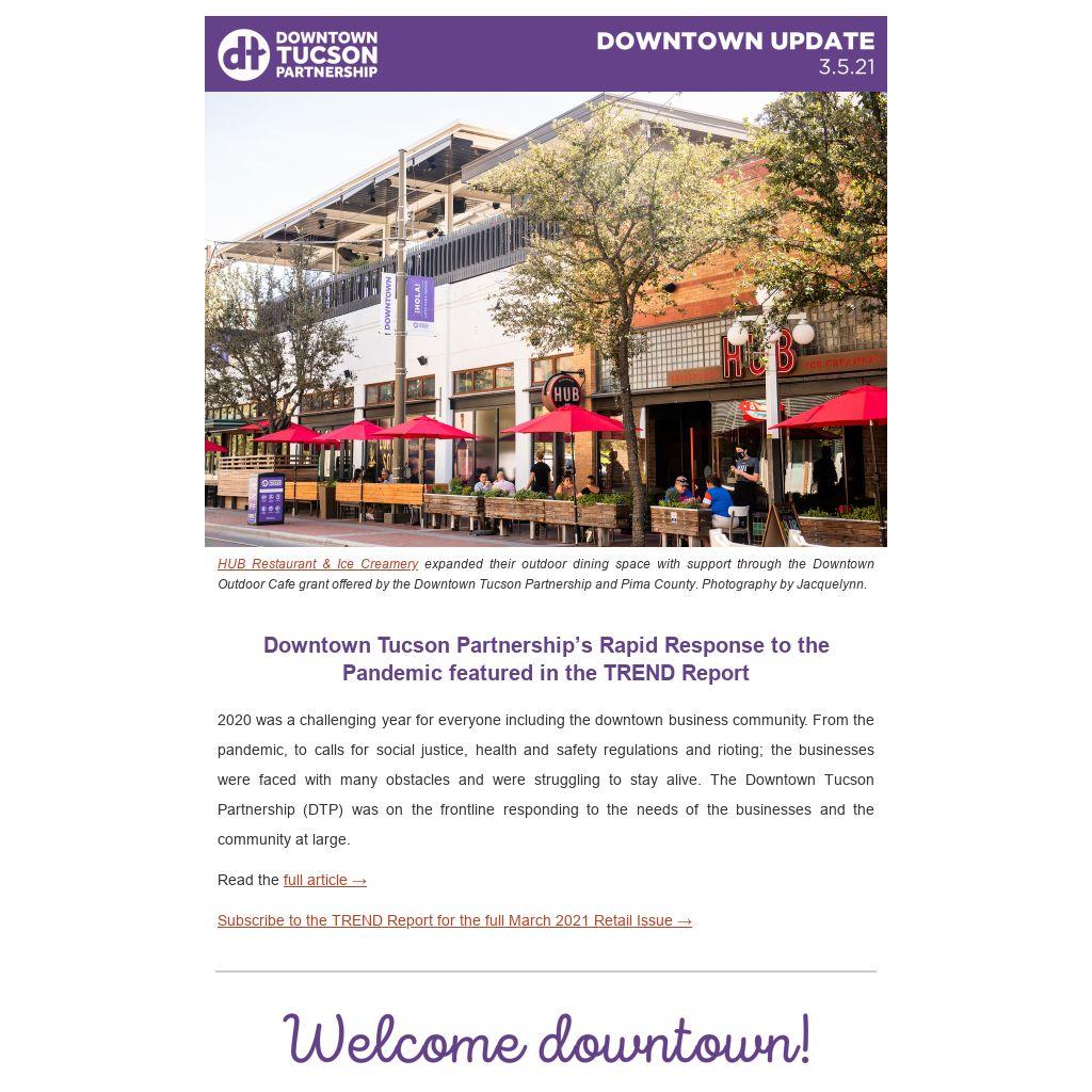 DTP would like to thank Pima County and Paradigm Laboratories for providing the community with free COVID-19 testing in Downtown Tucson. Thanks to TEP for providing a centralized and safe space, and to Park Tucson for providing free 30-minute testing parking for patients.