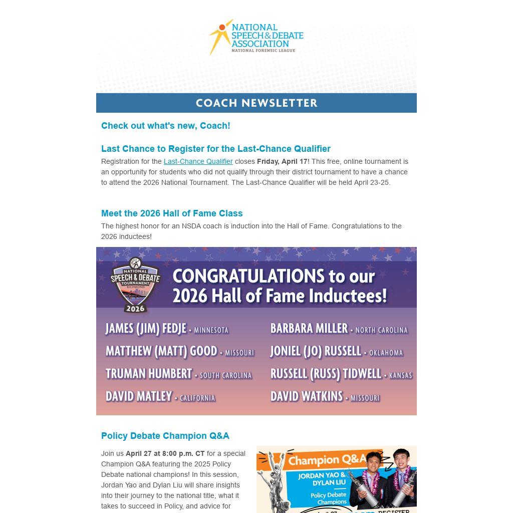 The highest honor for an NSDA coach is induction into the Hall of Fame. Congratulations to the 2026 inductees!