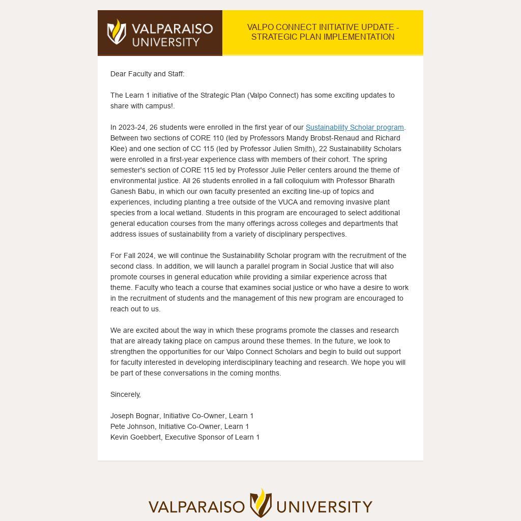 The Learn 1 initiative of the Strategic Plan (Valpo Connect) has some exciting updates to share with campus!.