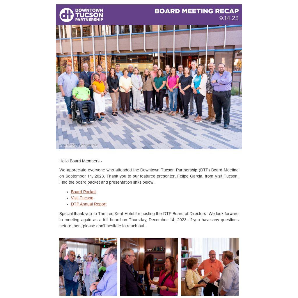 We appreciate everyone who attended the Downtown Tucson Partnership (DTP) Board Meeting on September 14, 2023. Thank you to our featured presenter, Felipe Garcia, from Visit Tucson! Find the board packet and presentation links below.