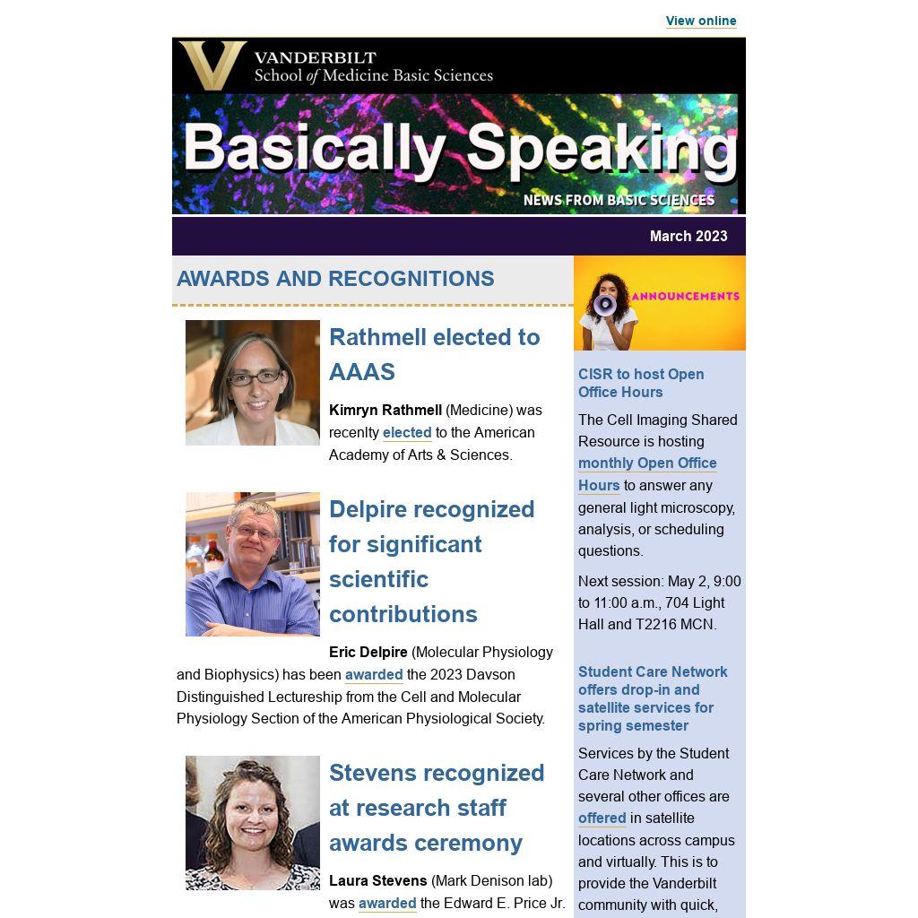 About the newsletterThis newsletter recognizes the achievements and latest discoveries of students, postdocs, faculty, and staff associated with Basic Sciences departments, centers, and cores or who carry out basic biomedical research at Vanderbilt.