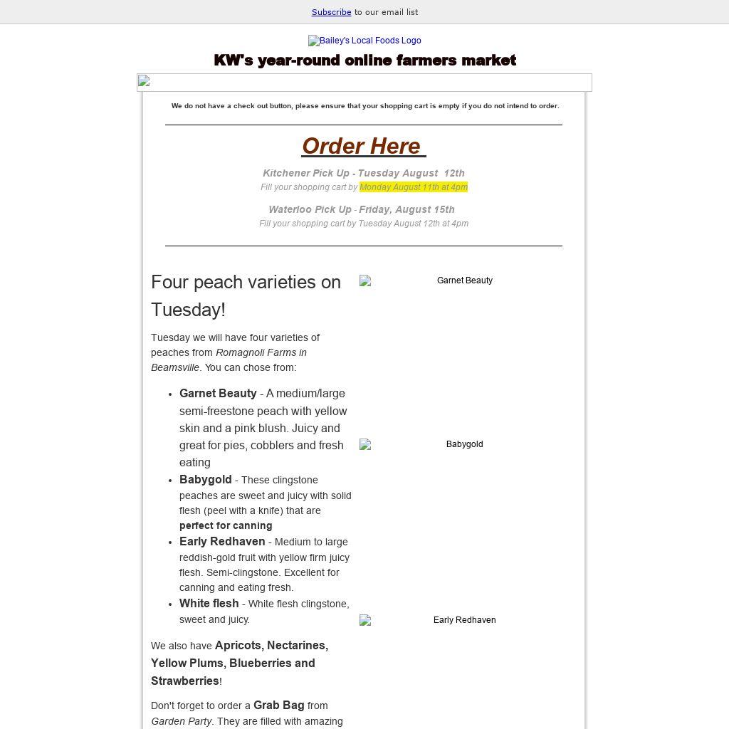 Tuesday we will have four varieties of peaches from Romagnoli Farms in Beamsville. You can chose from:- Garnet Beauty - A medium/large semi-freestone peach with yellow skin and a pink blush. Juicy and great for pies, cobblers and fresh eating