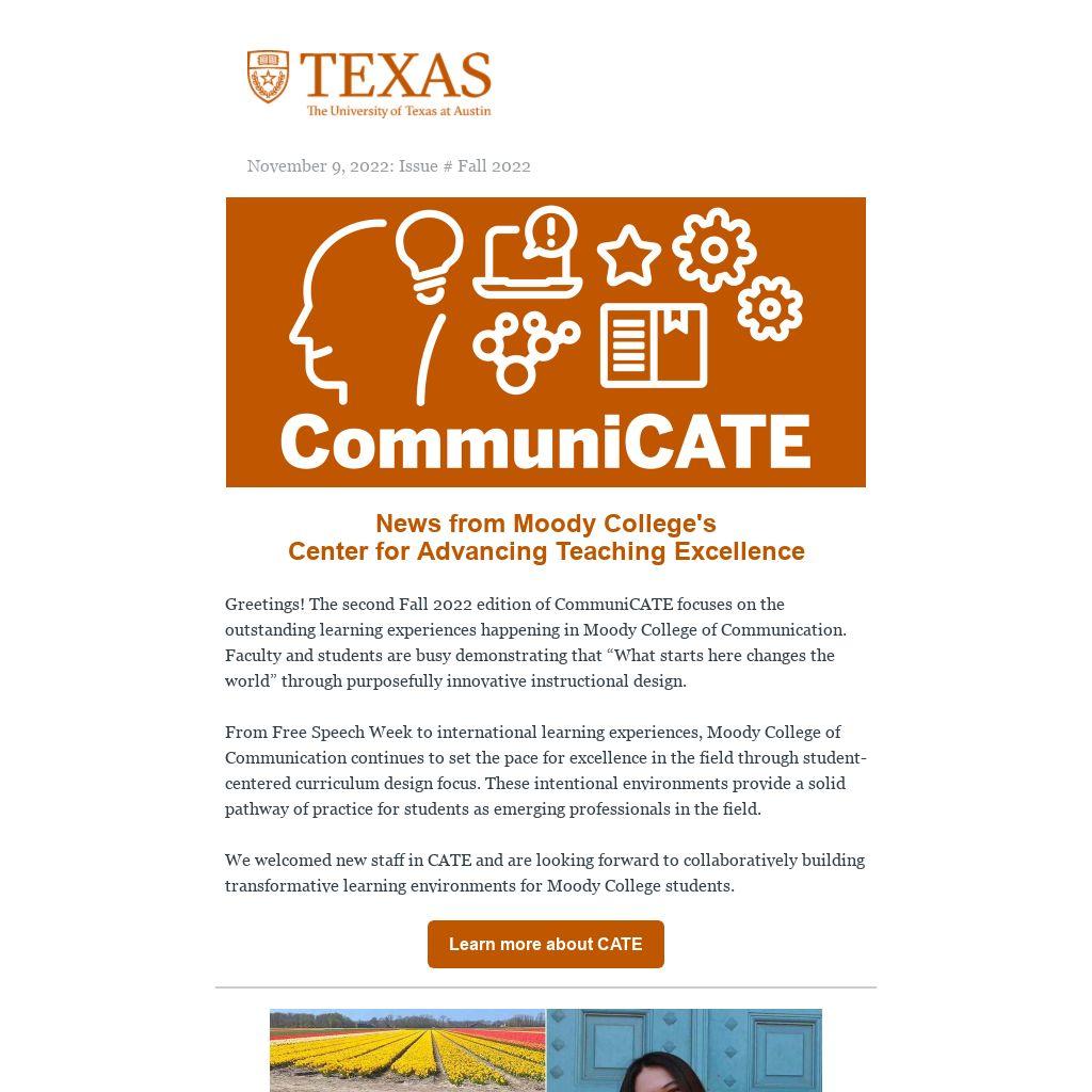Greetings! The second Fall 2022 edition of CommuniCATE focuses on the outstanding learning experiences happening in Moody College of Communication. Faculty and students are busy demonstrating that “What starts here changes the world” through purposefully innovative instructional design.