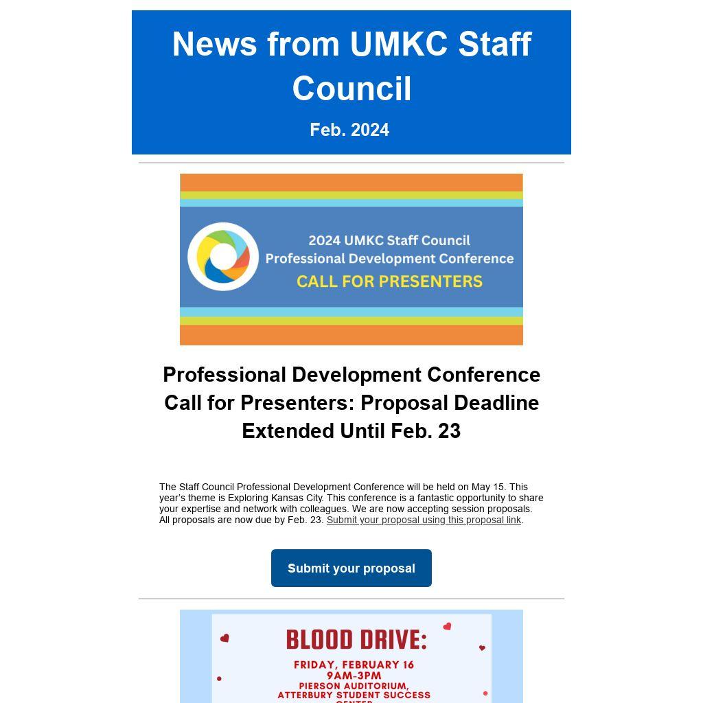 The Staff Council Professional Development Conference will be held on May 15. This year’s theme is Exploring Kansas City. This conference is a fantastic opportunity to share your expertise and network with colleagues. We are now accepting session proposals. All proposals are now due by Feb. 23. Submit your proposal using this proposal link.