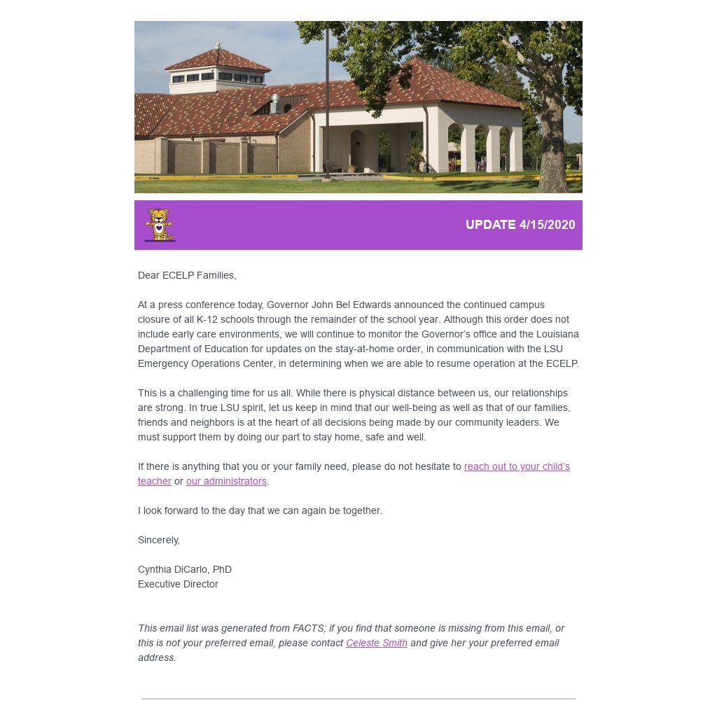 At a press conference today, Governor John Bel Edwards announced the continued campus closure of all K-12 schools through the remainder of the school year. Although this order does not include early care environments, we will continue to monitor the Governor’s office and the Louisiana Department of Education for updates on the stay-at-home order, in communication with the LSU Emergency Operations Center, in determining when we are able to resume operation at the ECELP.