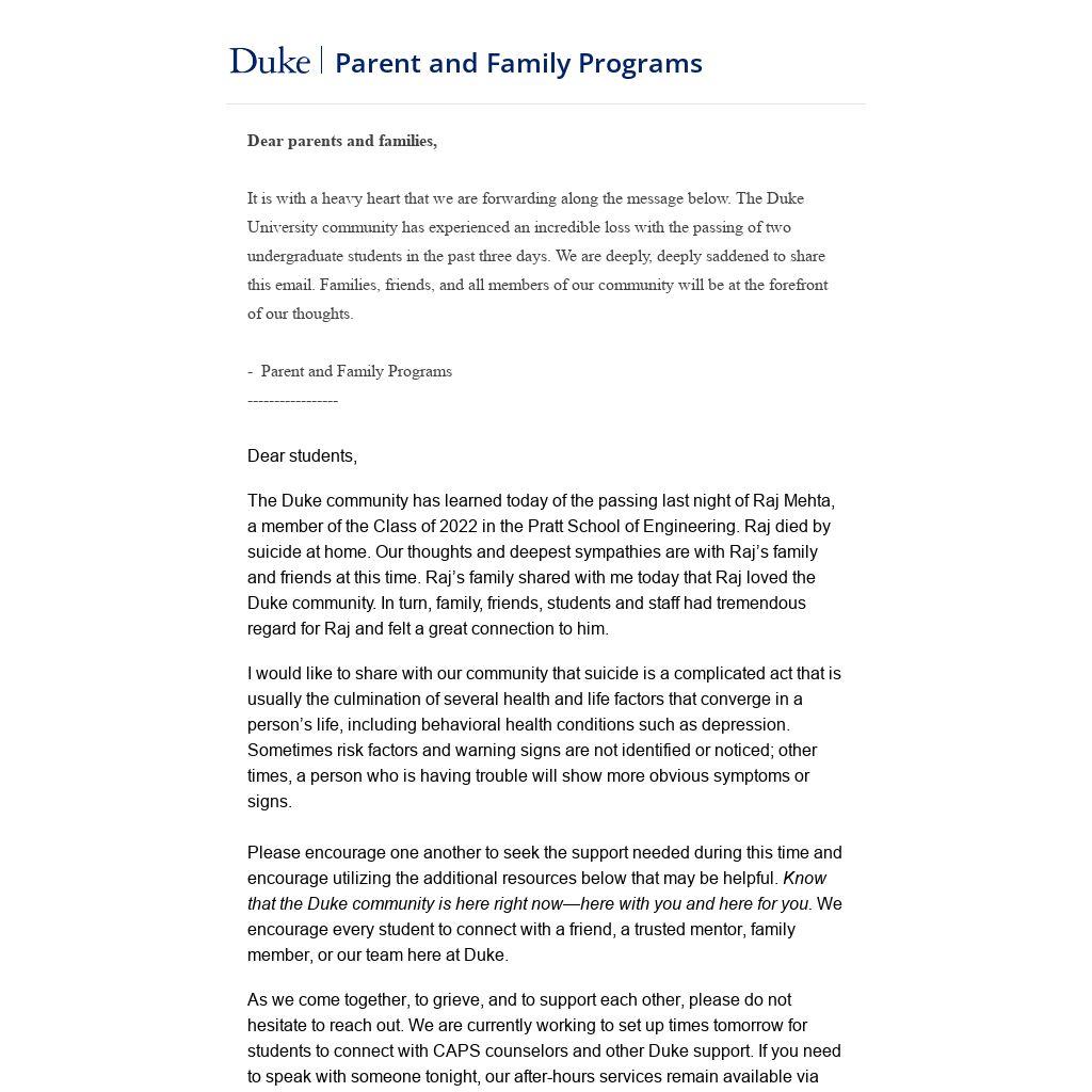 It is with a heavy heart that we are forwarding along the message below. The Duke University community has experienced an incredible loss with the passing of two undergraduate students in the past three days. We are deeply, deeply saddened to share this email. Families, friends, and all members of our community will be at the forefront of our thoughts.