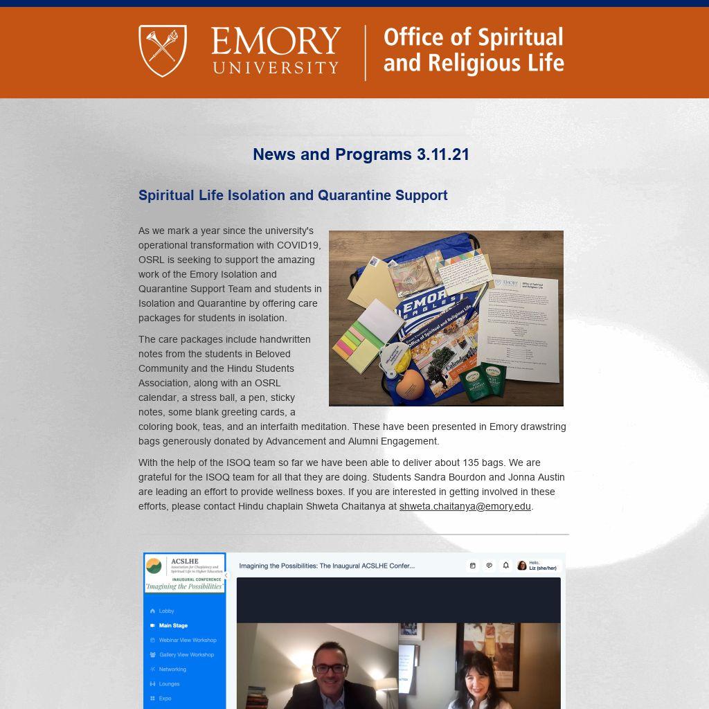 Emory OSRL Enews is published weekly during term by the Emory University Office of Spiritual and Religious Life covering Atlanta-campus programs. For Oxford College spiritual life, please click here. To submit information or to update your preferences, please contact religiouslife@emory.edu.