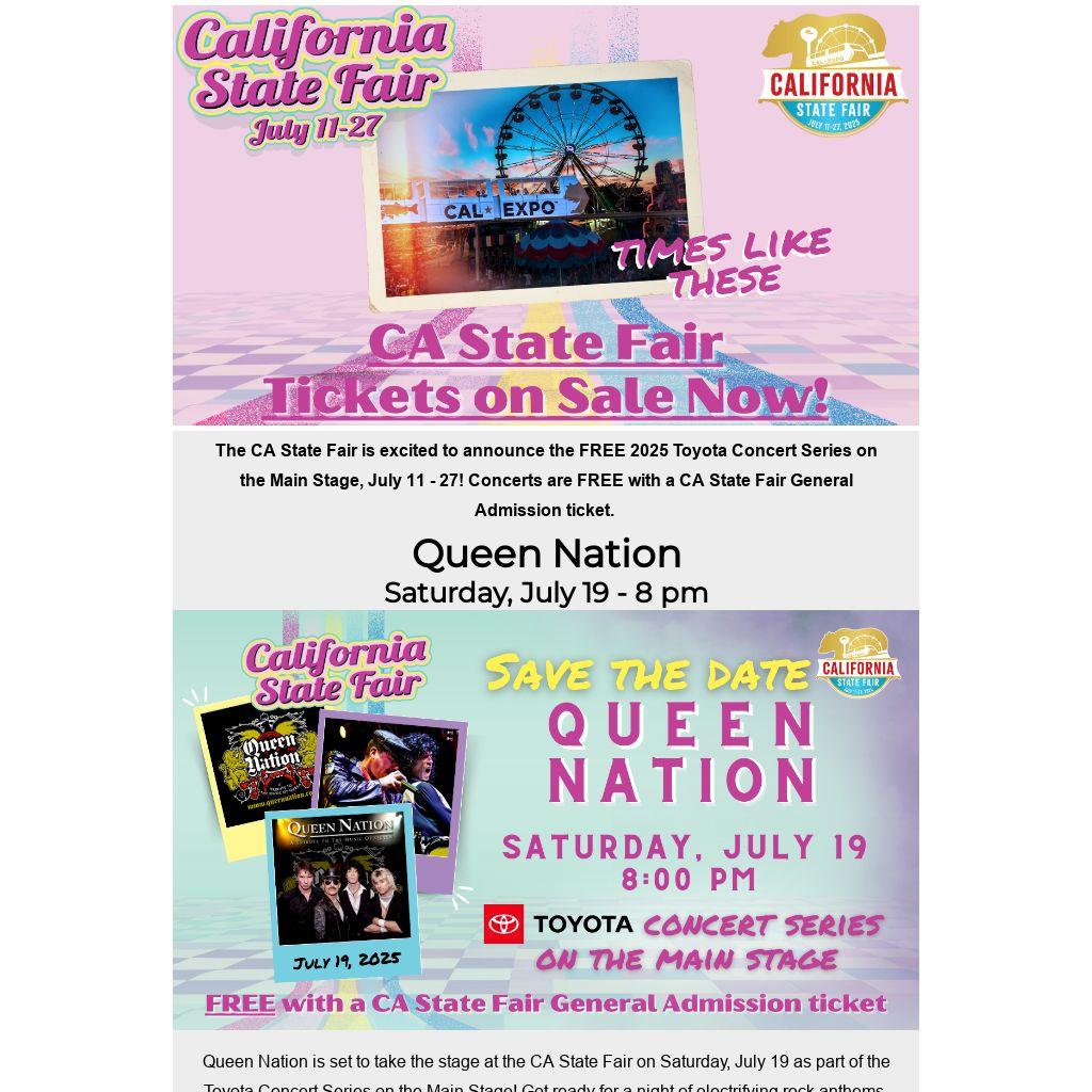Queen Nation is set to take the stage at the CA State Fair on Saturday, July 19 as part of the Toyota Concert Series on the Main Stage! Get ready for a night of electrifying rock anthems. The concert is free with general fair admission. Come experience this iconic show and make memories at the fair, running from July 11 to 27!