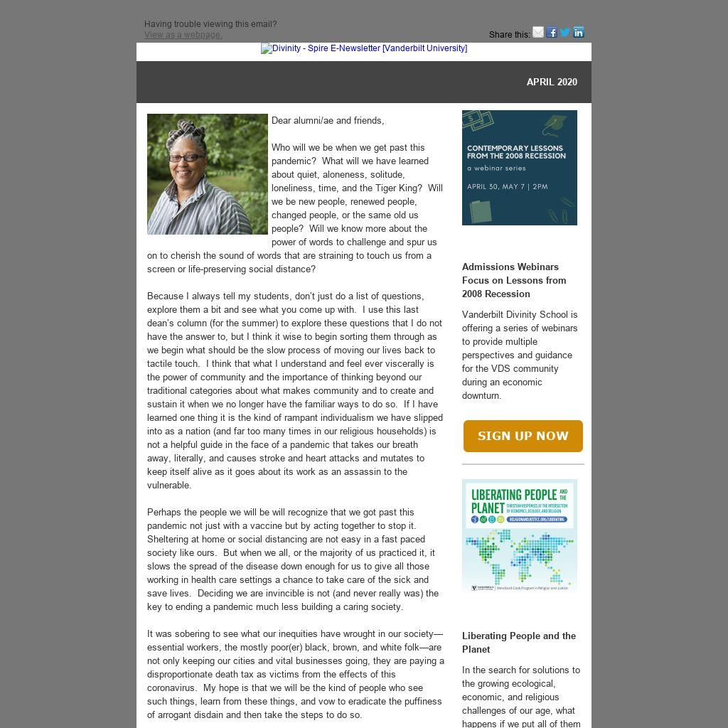 Because I always tell my students, don’t just do a list of questions, explore them a bit and see what you come up with. I use this last dean’s column (for the summer) to explore these questions that I do not have the answer to, but I think it wise to begin sorting them through as we begin what should be the slow process of moving our lives back to tactile touch. I think that what I understand and feel ever viscerally is the power of community and the importance of thinking beyond our traditional categories about what makes community and to create and sustain it when we no longer have the familiar ways to do so. If I have learned one thing it is the kind of rampant individualism we have slipped into as a nation (and far too many times in our religious households) is not a helpful guide in the face of a pandemic that takes our breath away, literally, and causes stroke and heart attacks and mutates to keep itself alive as it goes about its work as an assassin to the vulnerable.