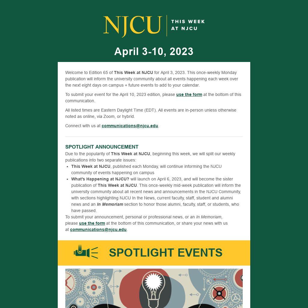 - This Week at NJCU, published each Monday, will continue informing the NJCU community of events happening on campus