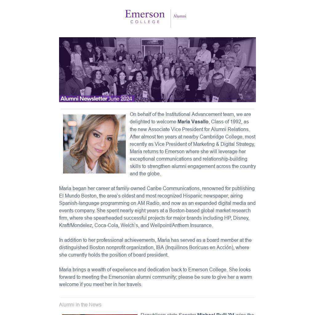On behalf of the Institutional Advancement team, we are delighted to welcome Maria Vasallo, Class of 1992, as the new Associate Vice President for Alumni Relations. After almost ten years at nearby Cambridge College, most recently as Vice President of Marketing & Digital Strategy, Maria returns to Emerson where she will leverage her exceptional communications and relationship-building skills to strengthen alumni engagement across the country and the globe.