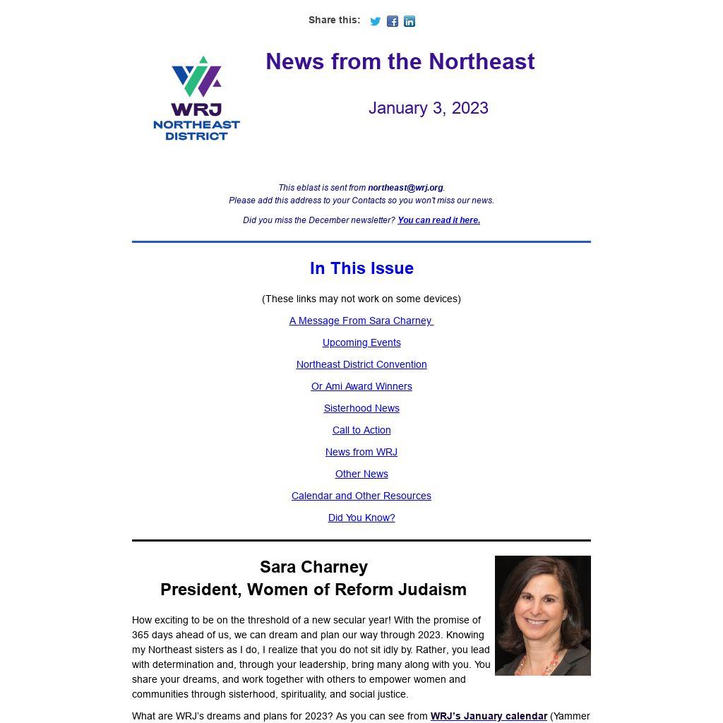 Has your sisterhood or women's organization had an event or gathering that you would like to share? Whether you had a new program, a special speaker, or a fun event you've held many times before, your event could inspire other sisterhoods. Send us a photo or two of your event, along with a description (event name, what was happening, etc.) that we can share on our district social media. We may also include it in our Sisterhood News section in News from the Northeast. You can send information to us at wrjneblast@gmail.com.
