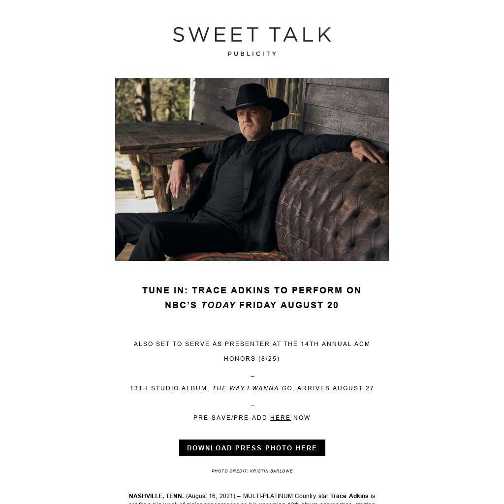 Following the TODAY stopover, Adkins will also serve as a presenter at the 14th annual ACM Honors. There he’ll join a star-studded night that celebrates Luke Combs, Dan + Shay, Rascal Flatts and more at Nashville’s Ryman Auditorium, all taking place on August 25 – just two days before THE WAY I WANNA GO is released.