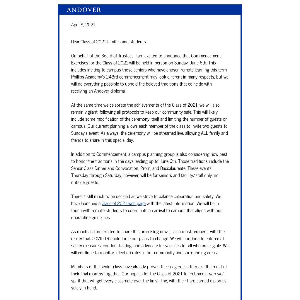 On behalf of the Board of Trustees, I am excited to announce that Commencement Exercises for the Class of 2021 will be held in person on Sunday, June 6th. This includes inviting to campus those seniors who have chosen remote learning this term. Phillips Academy’s 243rd commencement may look different in many respects, but we will do everything possible to uphold the beloved traditions that coincide with receiving an Andover diploma.