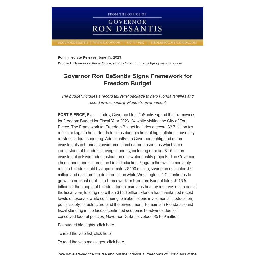 Additionally, the Framework for Freedom Budget includes $75 million to support the Florida Job Growth Grant Fund, which helps fund projects that support public infrastructure and expand workforce education opportunities.