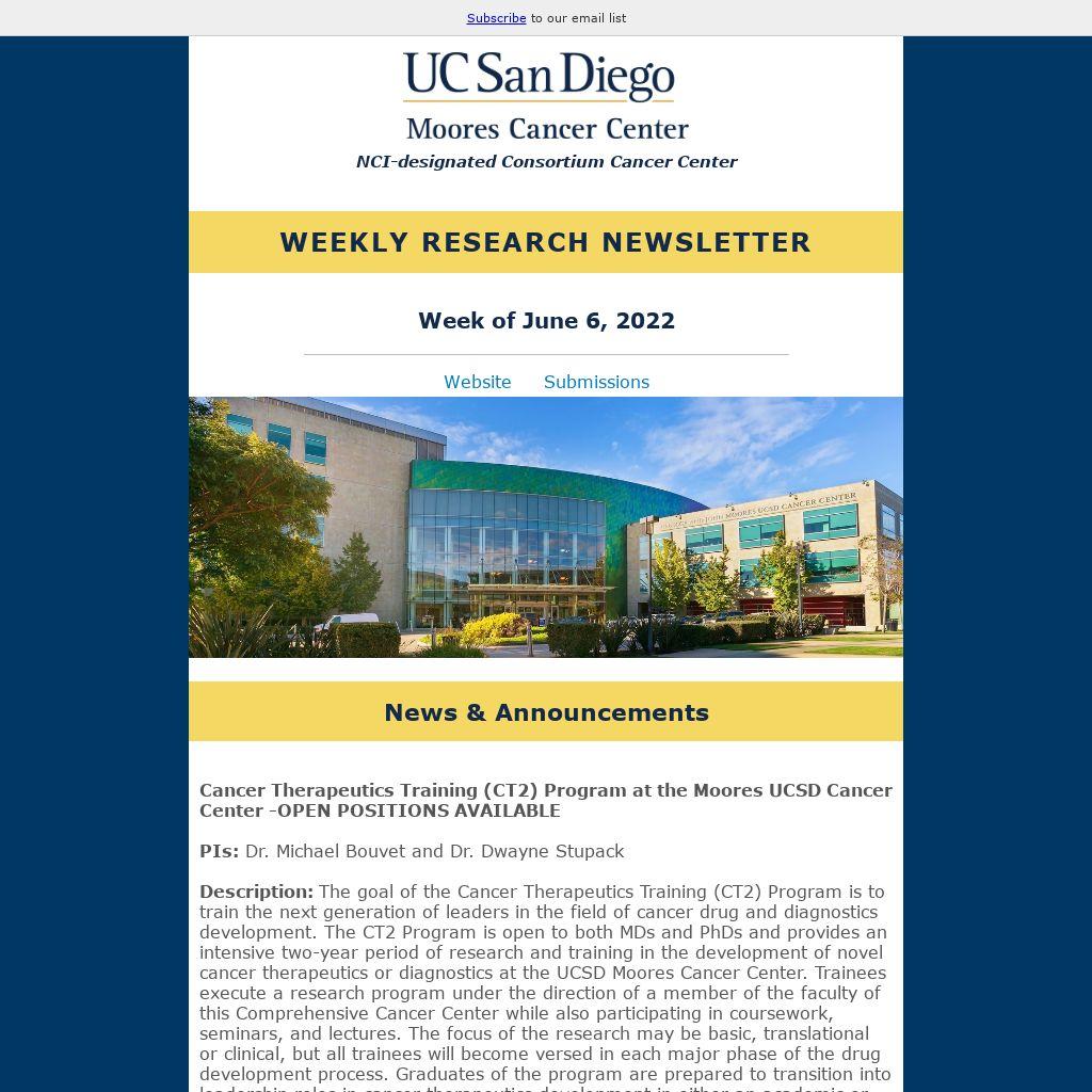 If you have newsworthy items to contribute, please contact our Marketing & Communications Manager, Renee Maude at amaude@health.ucsd.edu.