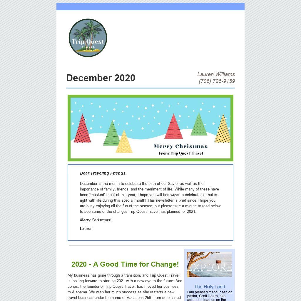 My business has gone through a transition, and Trip Quest Travel is looking forward to starting 2021 with a new eye to the future. Ann Jones, the founder of Trip Quest Travel, has moved her business to Alabama. We wish her much success as she restarts a new travel business under the name of Vacations 256. I am so pleased that Liza Dozier, Gail Pendergrast, and Mary Trobaugh will continue to work in the Augusta area in travel next year with me. With our team, we are able to prioritize you in designing custom trips to Europe, Disney, Alaska, or wherever your wanderlust takes you!