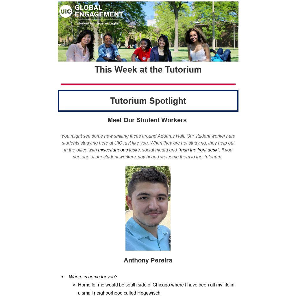The newsletter editorial team is looking for students like you to write for the Tutorium newsletter. If you are interested, fill out this google form or you can email Mrs. Nora to let her know (ntatina@uic.edu).