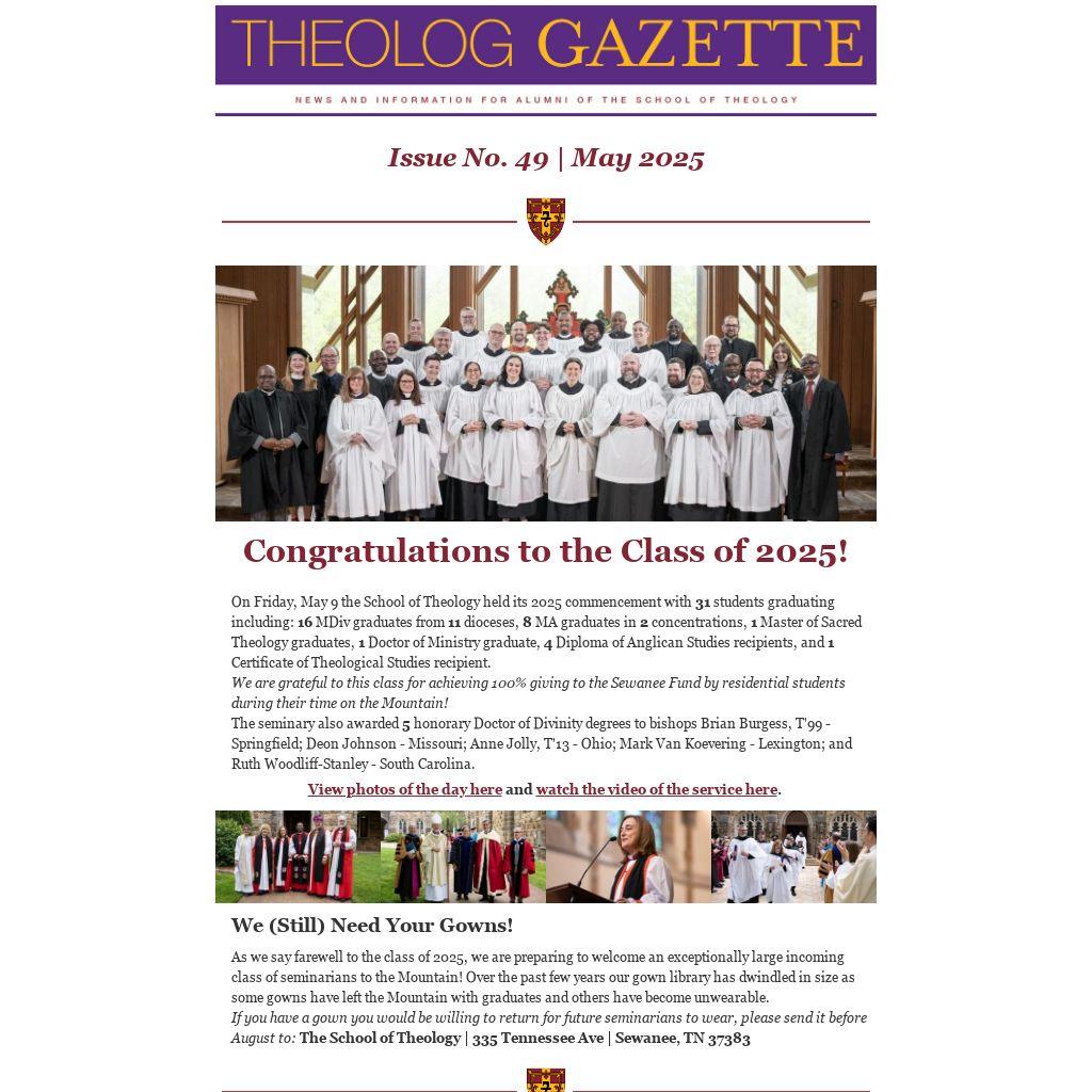 On Friday, May 9 the School of Theology held its 2025 commencement with 31 students graduating including: 16 MDiv graduates from 11 dioceses, 8 MA graduates in 2 concentrations, 1 Master of Sacred Theology graduates, 1 Doctor of Ministry graduate, 4 Diploma of Anglican Studies recipients, and 1 Certificate of Theological Studies recipient.