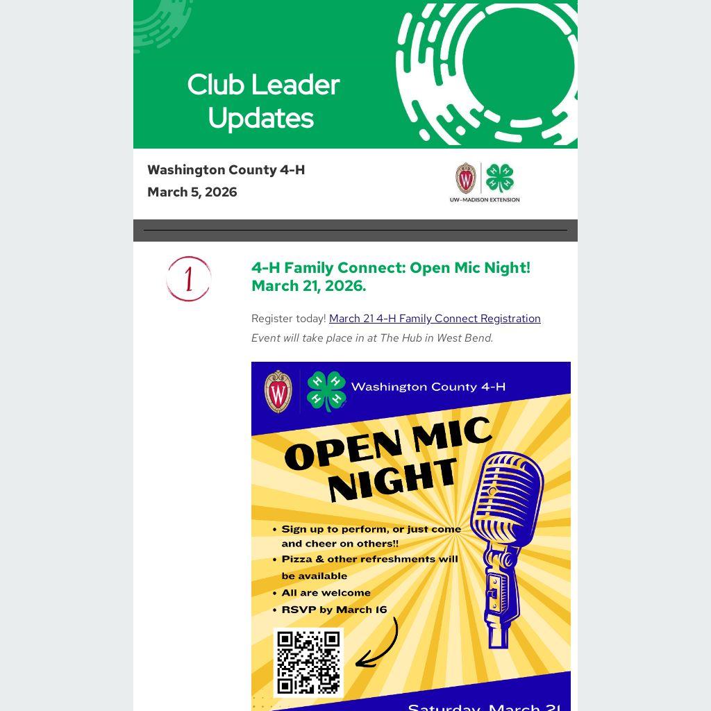 4-H Family Connect: Open Mic Night! March 21, 2026. |
