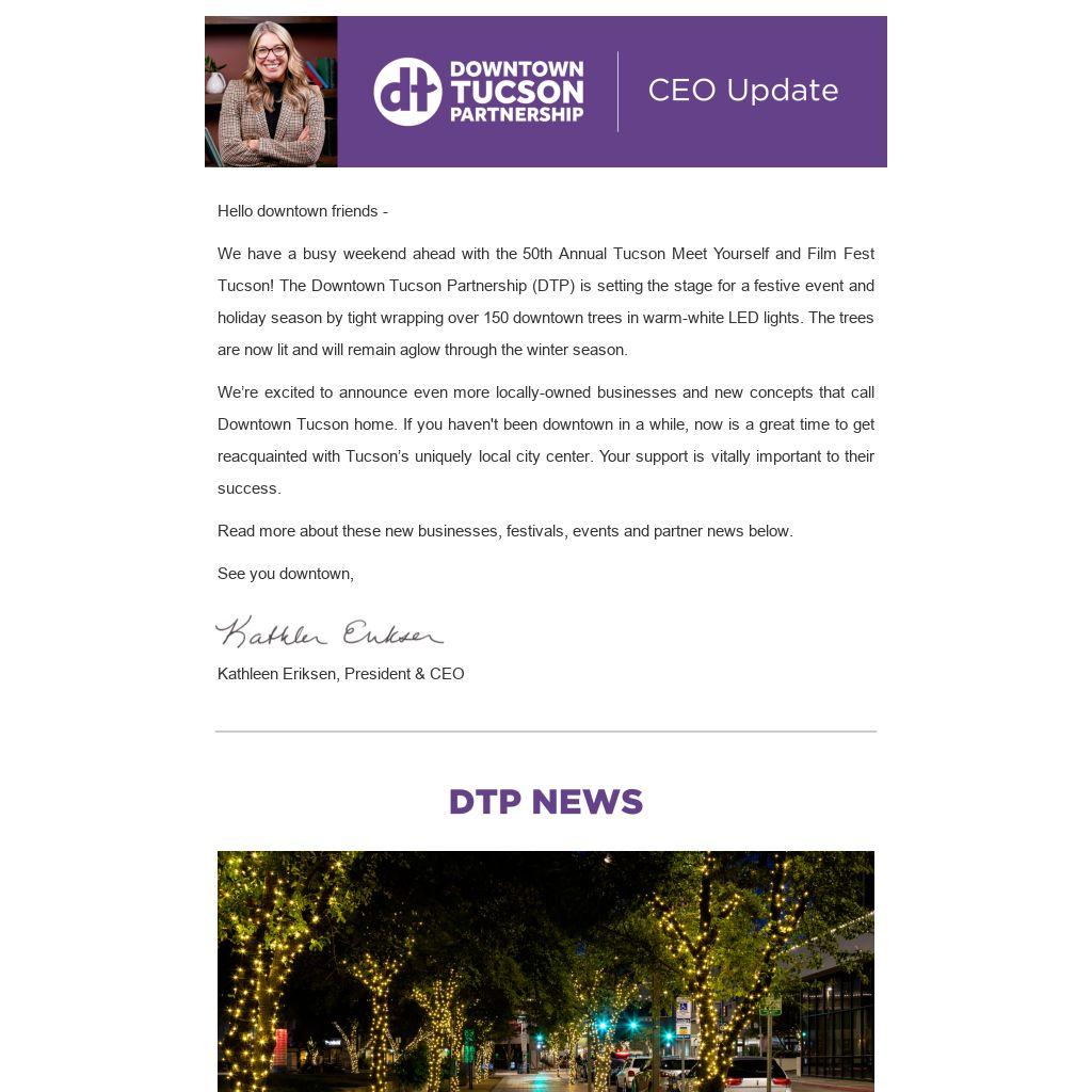 We have a busy weekend ahead with the 50th Annual Tucson Meet Yourself and Film Fest Tucson! The Downtown Tucson Partnership (DTP) is setting the stage for a festive event and holiday season by tight wrapping over 150 downtown trees in warm-white LED lights. The trees are now lit and will remain aglow through the winter season.