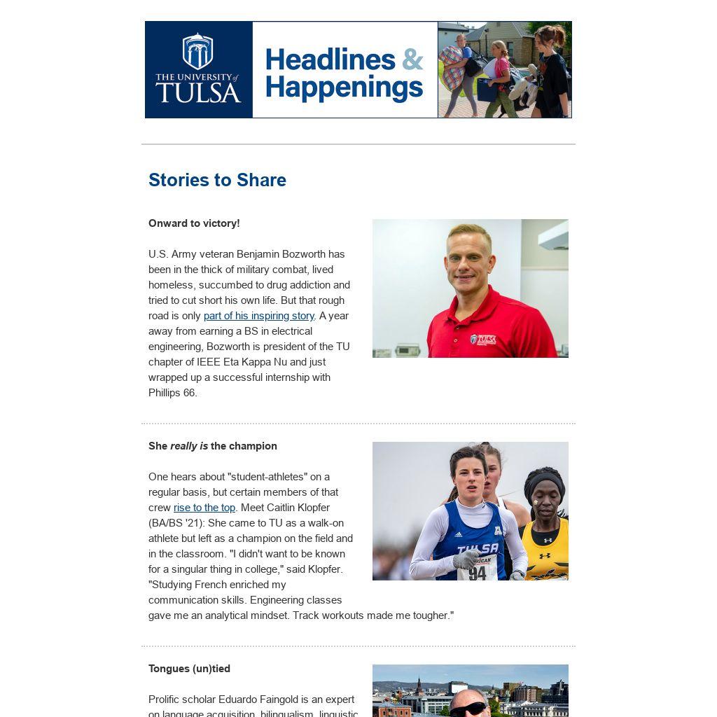 U.S. Army veteran Benjamin Bozworth has been in the thick of military combat, lived homeless, succumbed to drug addiction and tried to cut short his own life. But that rough road is only part of his inspiring story. A year away from earning a BS in electrical engineering, Bozworth is president of the TU chapter of IEEE Eta Kappa Nu and just wrapped up a successful internship with Phillips 66.