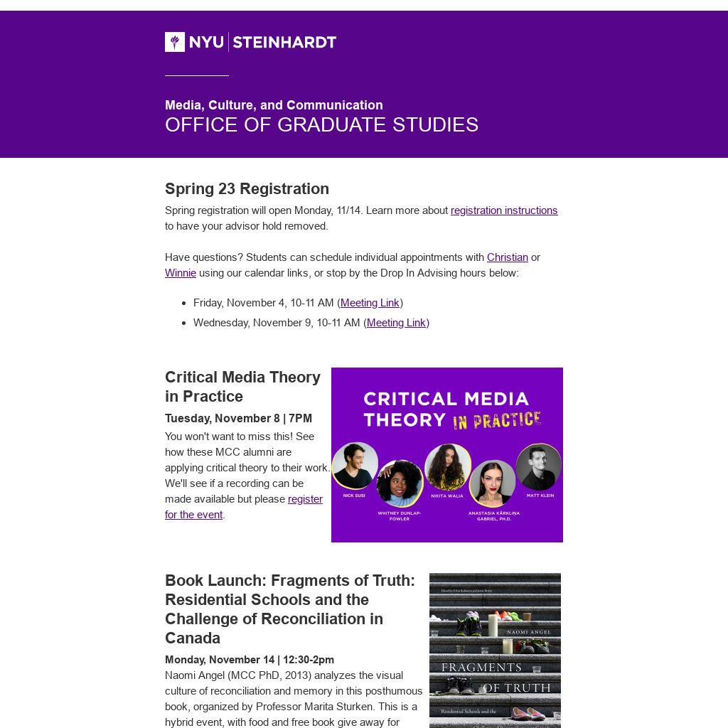 Critical Media Theory in PracticeTuesday, November 8 | 7PMYou won't want to miss this! See how these MCC alumni are applying critical theory to their work. We'll see if a recording can be made available but please register for the event.