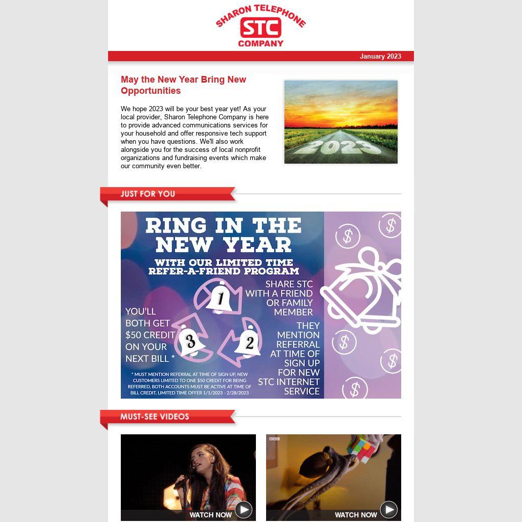 We hope 2023 will be your best year yet! As your local provider, Sharon Telephone Company is here to provide advanced communications services for your household and offer responsive tech support when you have questions. We'll also work alongside you for the success of local nonprofit organizations and fundraising events which make our community even better. |