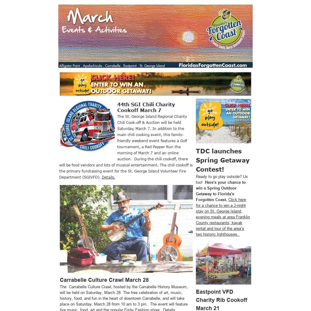 44th SGI Chili Charity Cookoff March 7 The St. George Island Regional Charity Chili Cook-off & Auction will be held Saturday, March 7. In addition to the main chili cooking event, this family-friendly weekend event features a Golf tournament, a Red Pepper Run the morning of March 7 and an online auction. During the chili cookoff, there will be food vendors and lots of musical entertainment. The chili cookoff is the primary fundraising event for the St. George Island Volunteer Fire Department (SGIVFD). Details.