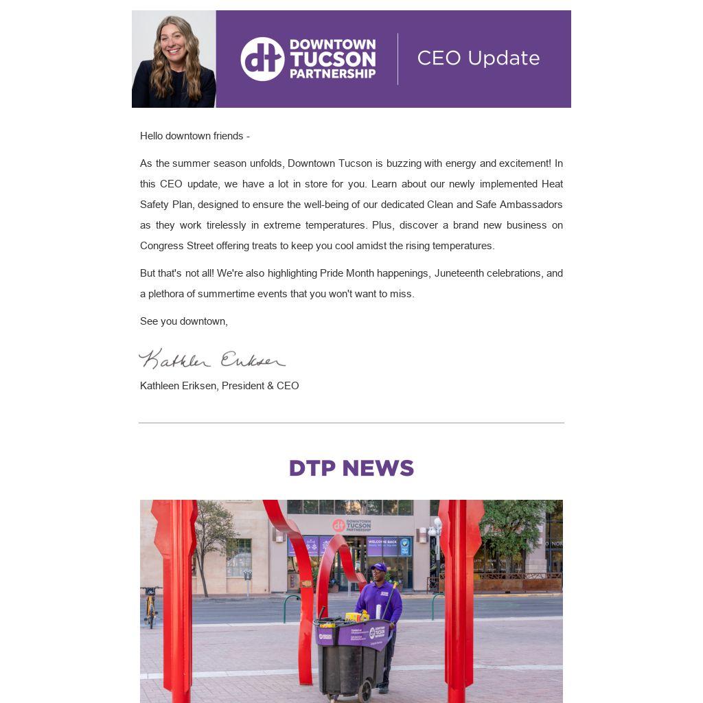 As the summer season unfolds, Downtown Tucson is buzzing with energy and excitement! In this CEO update, we have a lot in store for you. Learn about our newly implemented Heat Safety Plan, designed to ensure the well-being of our dedicated Clean and Safe Ambassadors as they work tirelessly in extreme temperatures. Plus, discover a brand new business on Congress Street offering treats to keep you cool amidst the rising temperatures.