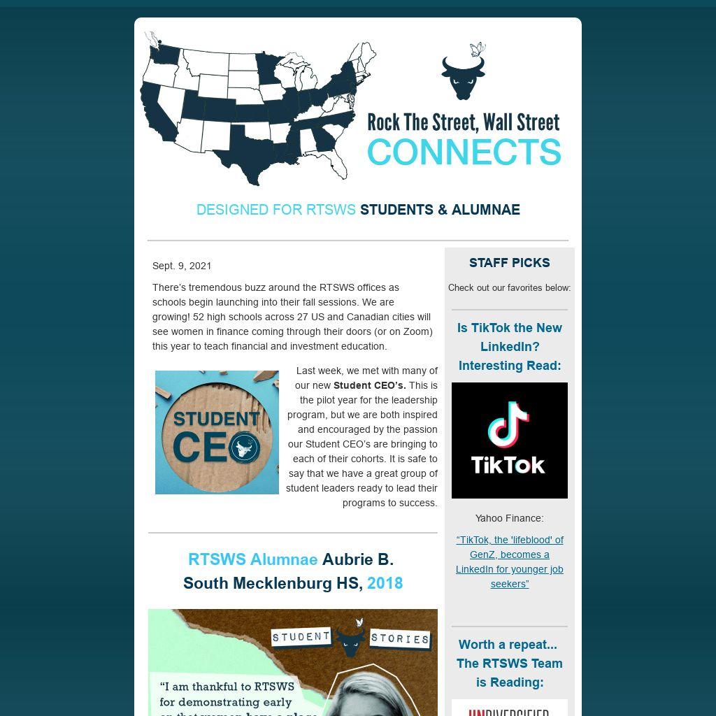 "RTSWS created a space where I felt comfortable and safe to ask questions, whether those were random (bitcoin, robinhood, logic behind crypto currencies...) or more traditional (what does banking services look like, differences between debt and equity...). Having early exposure to seeing women in banking roles gave me the confidence to pursue this path in college. My mentor was a UNC alumni and provided helpful insights into what I should expect during my first year of being a pre-business student. Being part of RTSWS made the start of college seem much less daunting."
