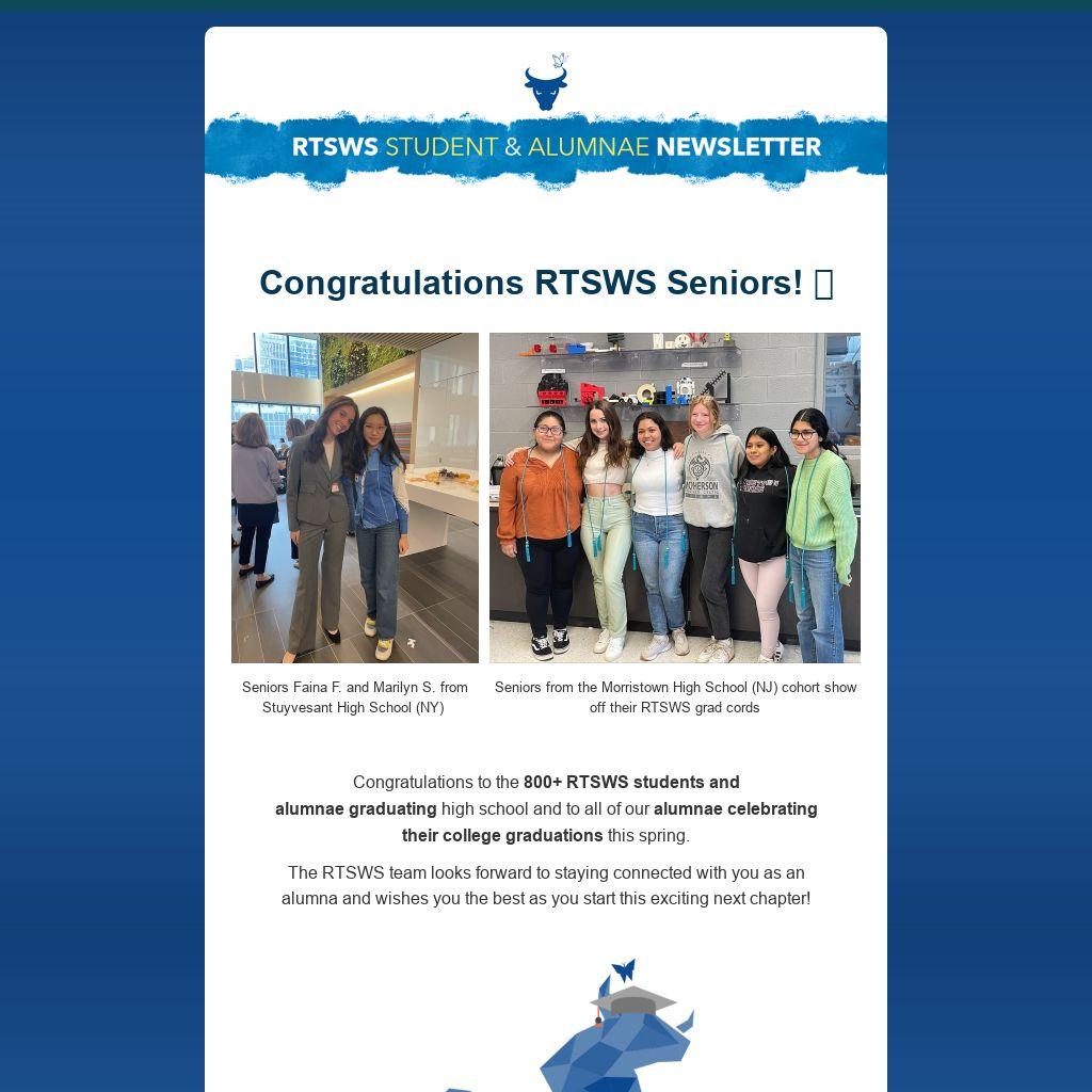 Congratulations to the 800+ RTSWS students and alumnae graduating high school and to all of our alumnae celebrating their college graduations this spring.