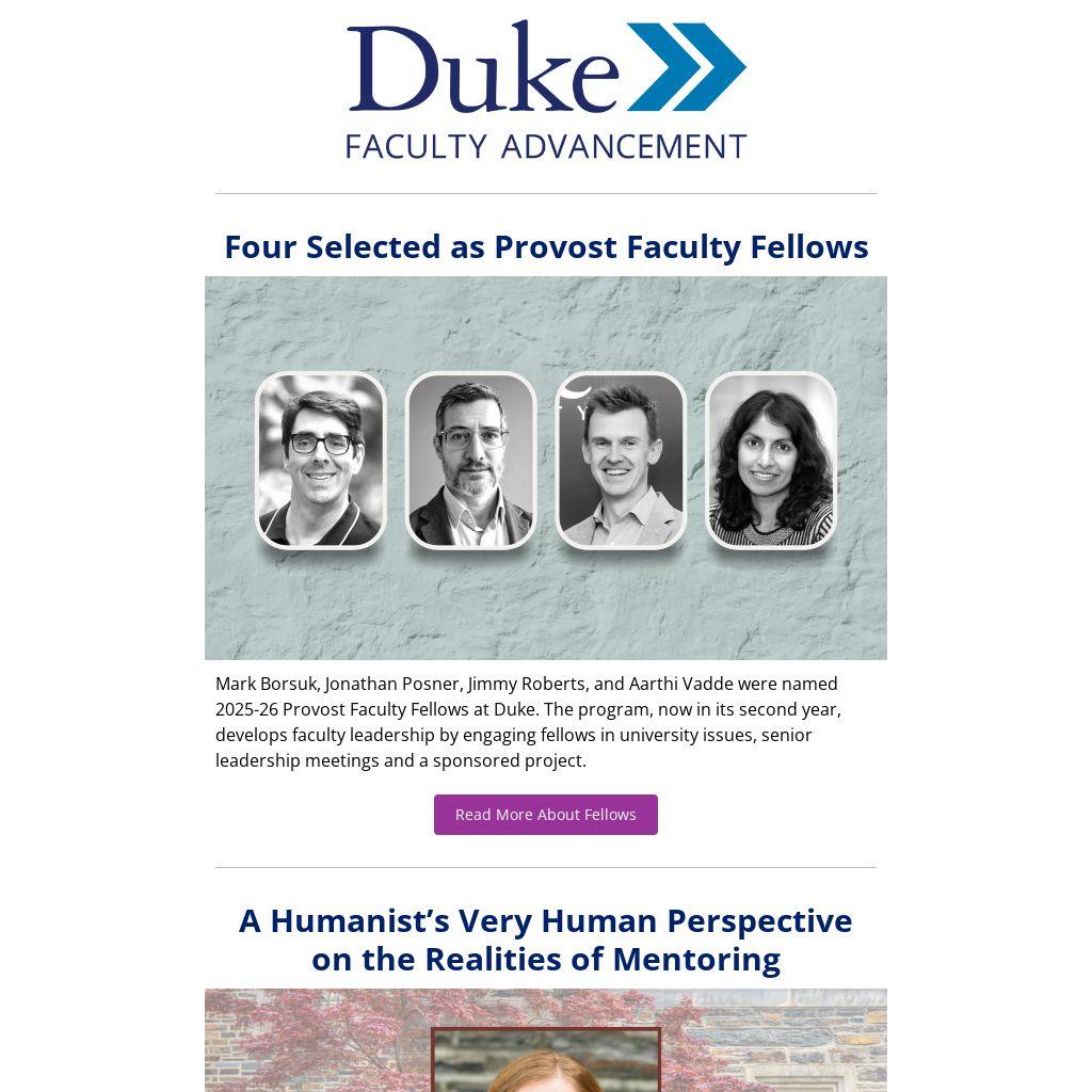 Mark Borsuk, Jonathan Posner, Jimmy Roberts, and Aarthi Vadde were named 2025-26 Provost Faculty Fellows at Duke. The program, now in its second year, develops faculty leadership by engaging fellows in university issues, senior leadership meetings and a sponsored project.