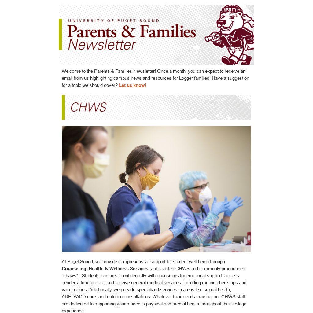 At Puget Sound, we provide comprehensive support for student well-being through Counseling, Health, & Wellness Services (abbreviated CHWS and commonly pronounced "chaws"). Students can meet confidentially with counselors for emotional support, access gender-affirming care, and receive general medical services, including routine check-ups and vaccinations. Additionally, we provide specialized services in areas like sexual health, ADHD/ADD care, and nutrition consultations. Whatever their needs may be, our CHWS staff are dedicated to supporting your student’s physical and mental health throughout their college experience.