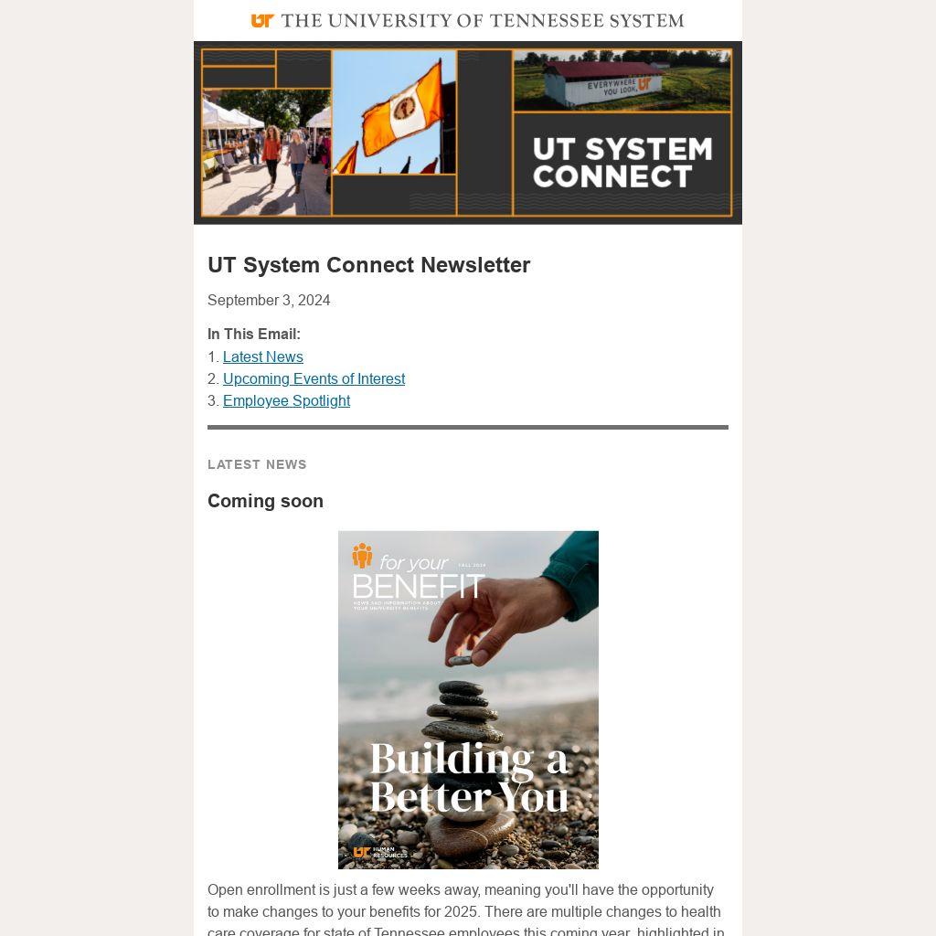 Open enrollment is just a few weeks away, meaning you'll have the opportunity to make changes to your benefits for 2025. There are multiple changes to health care coverage for state of Tennessee employees this coming year, highlighted in the upcoming issue of For Your Benefit. This issue will cover everything you need to know about open enrollment, ensuring you are equipped to make the best decision for you and your family. Look for it in your mailbox in the coming weeks.
