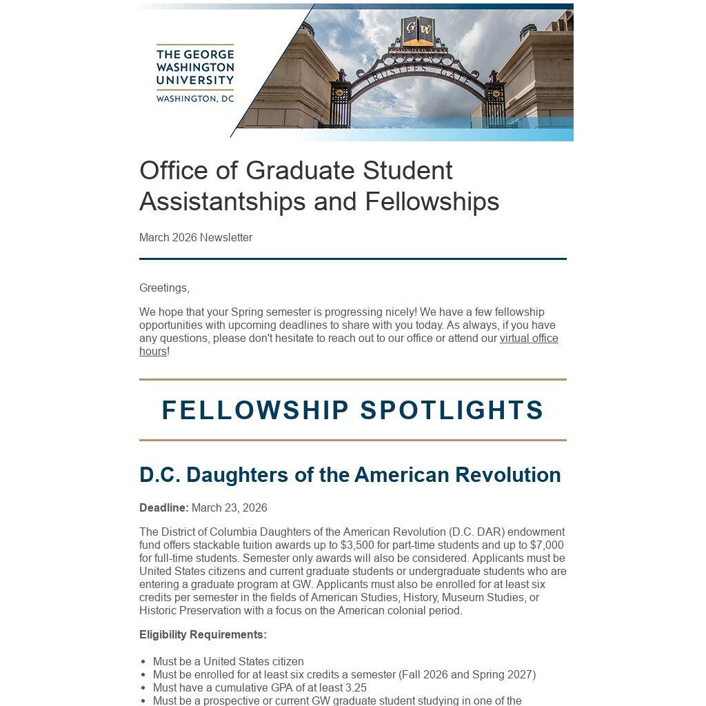 The Office of Graduate Student Assistantships and Fellowships serves as a resource for graduate students looking for funding opportunities at the George Washington University.