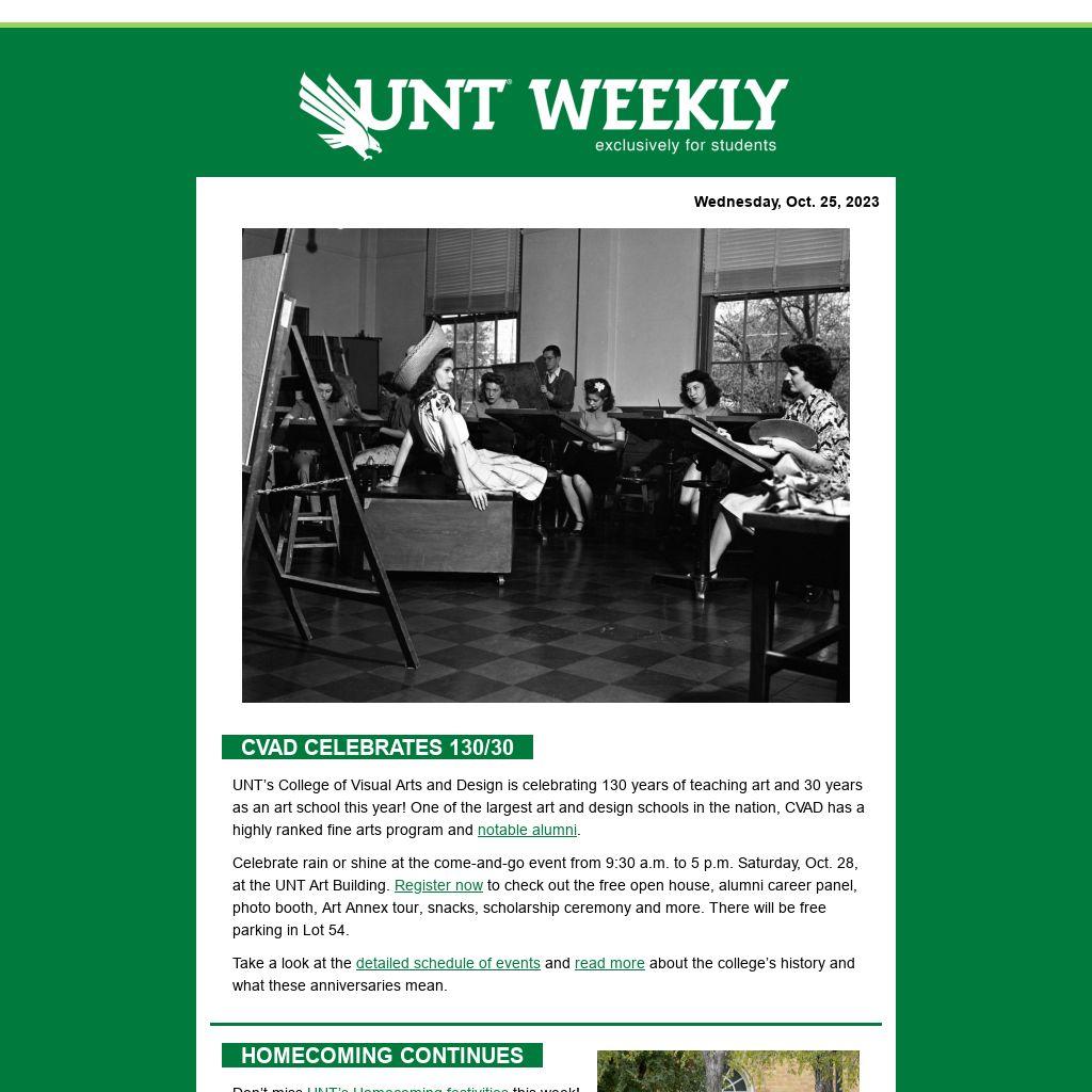 Celebrate rain or shine at the come-and-go event from 9:30 a.m. to 5 p.m. Saturday, Oct. 28, at the UNT Art Building. Register now to check out the free open house, alumni career panel, photo booth, Art Annex tour, snacks, scholarship ceremony and more. There will be free parking in Lot 54.