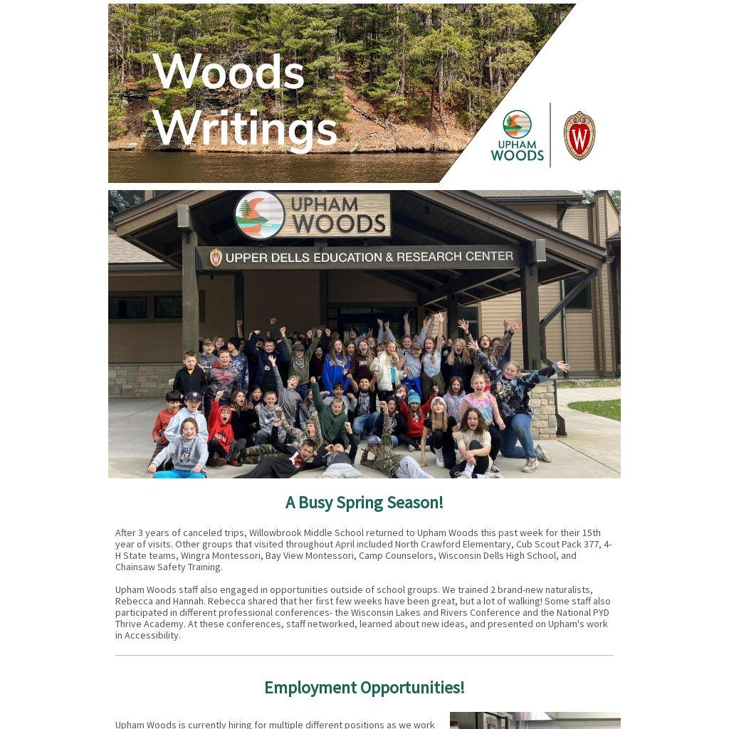 Upham Woods is currently hiring for multiple different positions as we work on creating an internal food service program instead of working through an external contractor. We are currently looking for 1 kitchen lead, 2 kitchen assistants, and a custodian. More information can be found on our website!