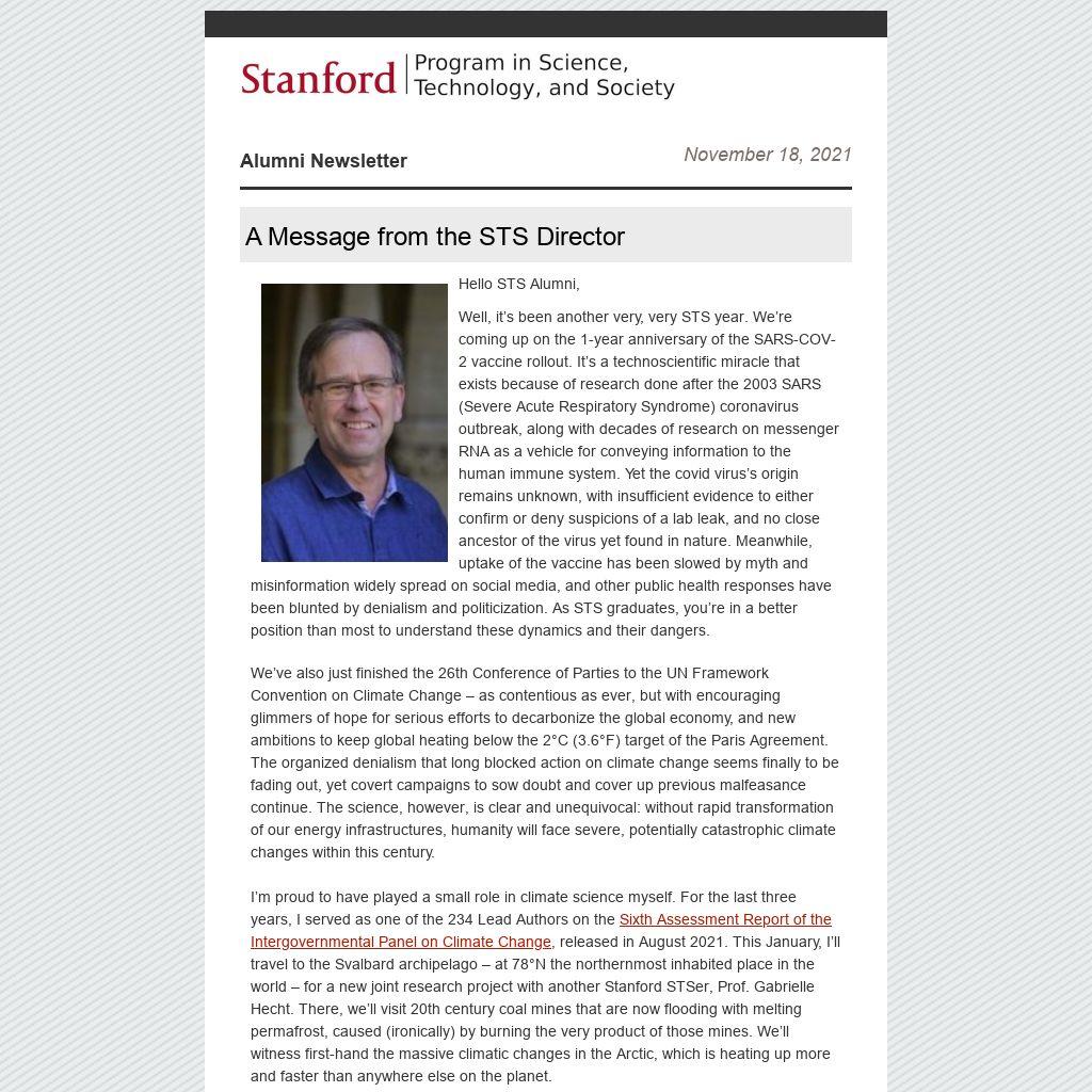 I’m proud to have played a small role in climate science myself. For the last three years, I served as one of the 234 Lead Authors on the Sixth Assessment Report of the Intergovernmental Panel on Climate Change, released in August 2021. This January, I’ll travel to the Svalbard archipelago – at 78°N the northernmost inhabited place in the world – for a new joint research project with another Stanford STSer, Prof. Gabrielle Hecht. There, we’ll visit 20th century coal mines that are now flooding with melting permafrost, caused (ironically) by burning the very product of those mines. We’ll witness first-hand the massive climatic changes in the Arctic, which is heating up more and faster than anywhere else on the planet.