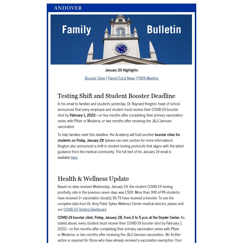 To help families meet this deadline, the Academy will hold another booster clinic for students on Friday, January 28 (please see next section for more information). Kington also announced a shift in student testing protocols that aligns with the latest guidance from the medical community. The full text of his January 19 email is available here.