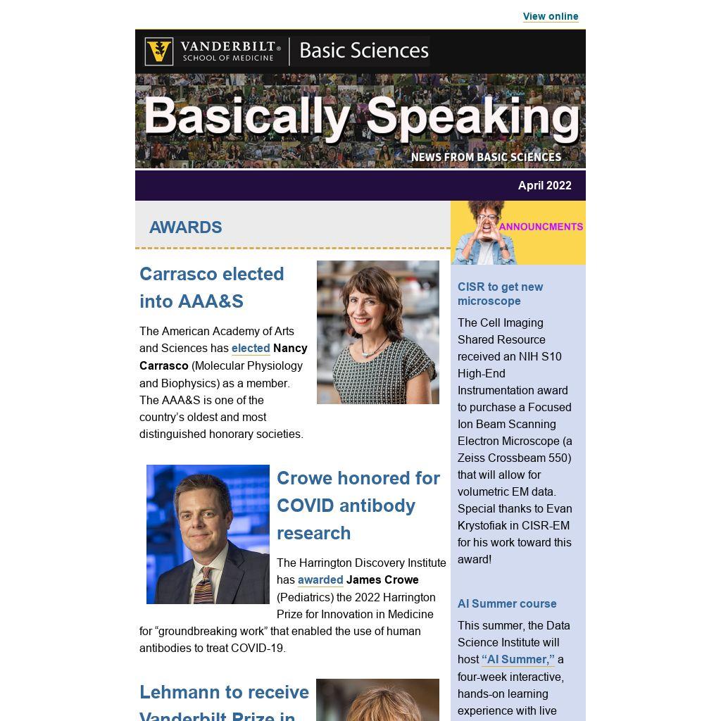 This newsletter recognizes the achievements and latest discoveries of students, postdocs, faculty, and staff associated with Basic Sciences departments, centers, and cores or who carry out basic biomedical research at Vanderbilt.
