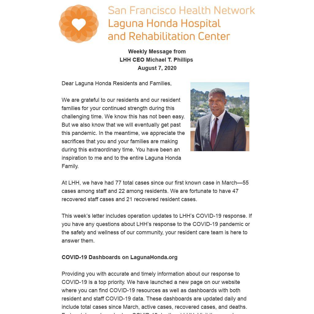 Recovered residents and staff will not be tested for three months after their recovery date, unless they develop COVID-19 symptoms. LHH has had 77 COVID-19 cases to-date and with our low-positive rate, thankfully this will not impact many staff or residents.