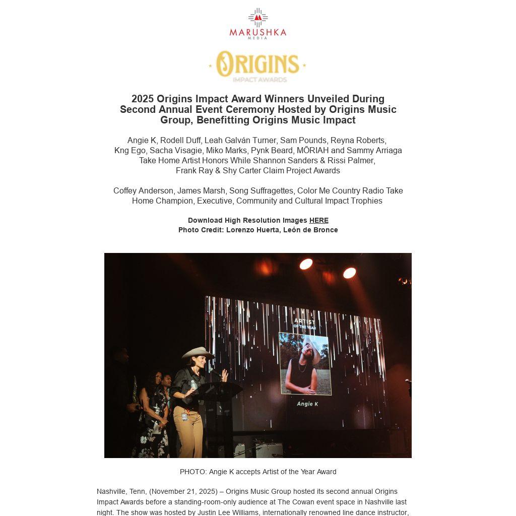Nashville, Tenn, (November 21, 2025) – Origins Music Group hosted its second annual Origins Impact Awards before a standing-room-only audience at The Cowan event space in Nashville last night. The show was hosted by Justin Lee Williams, internationally renowned line dance instructor, and emcee’d by journalist Marcus K. Dowling. The two-hour show — known as the musical, community and cultural event of the year — honored country music’s expanding sound through performances, tributes and activations.